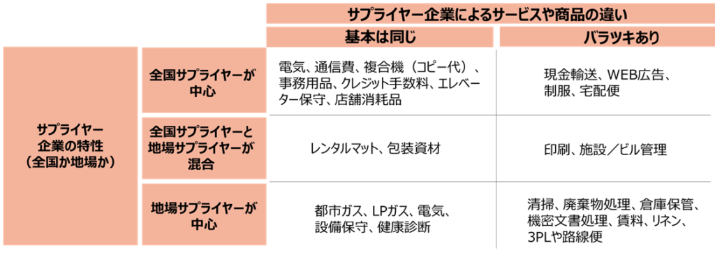 全国で統一するパターンが最も効果的といえますが、費目の特性によってエリアごとに取引先を変える選択や価格/料率の基準を設定するなどして、最も好条件を引き出せるようにすることが大切です。