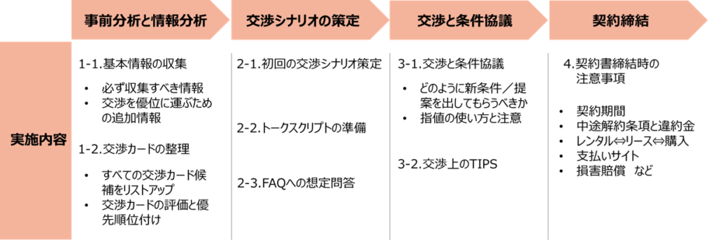 交渉の成否は事前の準備で決まると言っても過言ではありません。交渉の全体の流れとしては、1.事前準備と情報分析、2.交渉シナリオの策定、3.交渉と条件協議、4.契約締結の4つの段階があります。一般的にサプライヤーに要望がある場合いきなり3.交渉と条件協議から始まる場合がほとんどではないでしょうか。何の準備や分析もなくいきなり交渉に入っては自社が望む条件を引き出し、交渉を優位に運ぶことは不可能です。