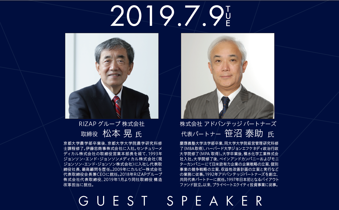 | 講演ゲスト | 松本晃 様(前カルビー会長兼CEO、現ライザップ取締役) 笹沼泰助 様(アドバンテッジ パートナーズ 代表パートナー) |