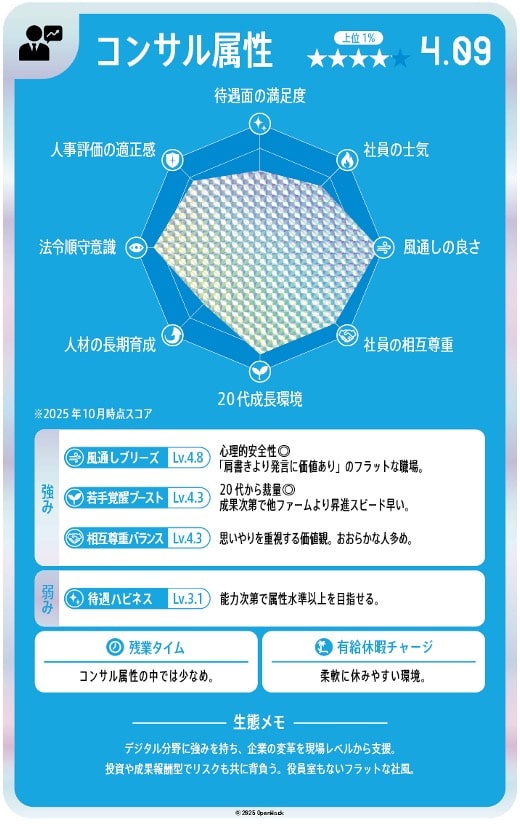 当社は特に「風通しの良さ」「20代成長環境」「社員の相互尊重」に対する社員・元社員からの評価が高い傾向にあります。社員クチコミからは、成果次第で他ファームより早く昇進できる裁量の高さやクライアントファーストが徹底された、やりがいのある職場に対するポジティブな声も多く見受けられました。